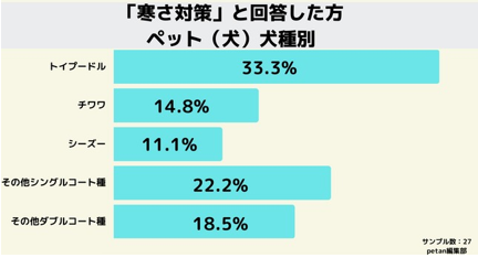 「寒さ対策」と回答した方のペット(犬)の犬種をみてみると、シングルコートのトイプードルが33.3%、その他シングルコート種が22.2%とシングルコート種が半分以上を占める結果となりました。