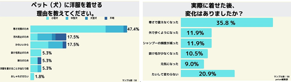 その他にも「汚れ防止(17.5%)」と多く、次で「かわいいから(17.5%)」と上位2つは「犬や飼い主が互いに快適に過ごせること」が理由で洋服を着せているということがわかる結果となりました。
