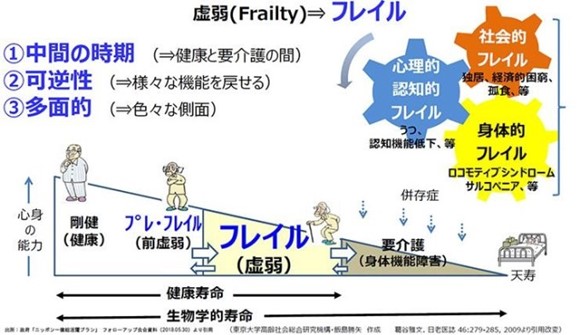 また、厚生労働省研究班の報告書では「加齢とともに心身の活力(運動機能や認知機能等)が低下し、複数の慢性疾患の併存などの影響もあり、生活機能が障害され、心身の脆弱性が出現した状態であるが、一方で適切な介入・支援により、生活機能の維持向上が可能な状態像」とも記されており、つまり健康な状態と日常生活でサポートが必要な介護状態の中間を意味している。