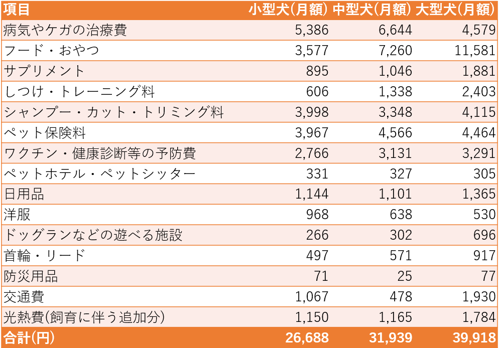 ワンちゃんの大きさや年齢によって違いますが、月間約27,000円から約40,000円の費用がかかることが分かります。