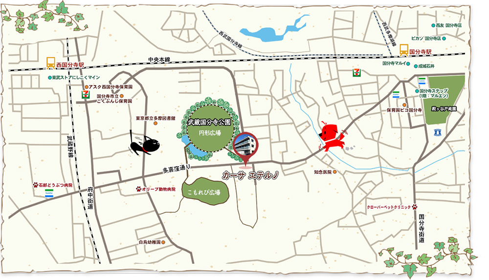 | 沿線・駅 | JR中央線「国分寺」駅 徒歩10分 JR中央線/武蔵野線「西国分寺」駅 徒歩14分 京王線「府中」駅 バス11分「泉町3丁目」バス停歩2分 |
